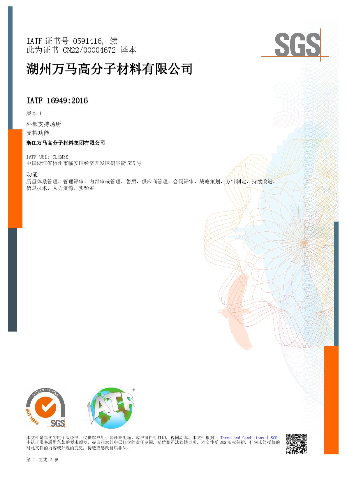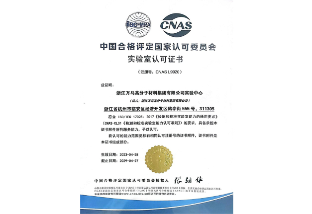万马高分子通过ISO9001 、ISO14001 、ISO45001三体系认证 、IATF16949认证 、ISO50001能源管理体系认证 、CNAS认证 、莱茵认证等。通过在品质管理领域加大投入,万马高分子持续努力提高产品质量,始终追求卓越品质。