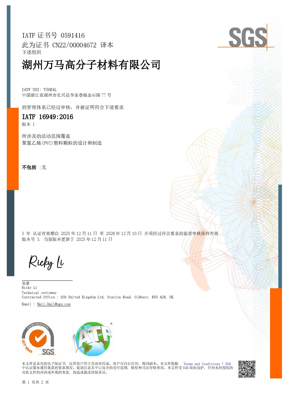 万马高分子通过ISO9001 、ISO14001 、ISO45001三体系认证 、IATF16949认证 、ISO50001能源管理体系认证 、CNAS认证 、莱茵认证等。通过在品质管理领域加大投入,万马高分子持续努力提高产品质量,始终追求卓越品质。